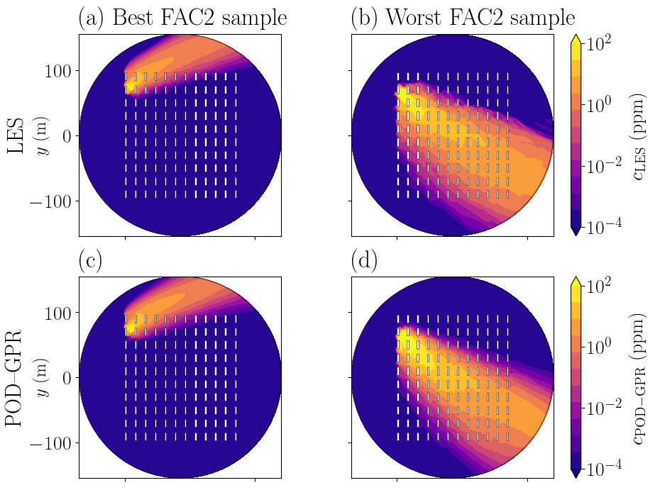 Figure 1: POD-GPR surrogate model mean concentration fields prediction examples.