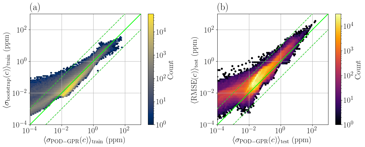 Figure 2: Reliability diagrams of the POD-GPR error versus its estimated internal variability (a) and total uncertainty (b).