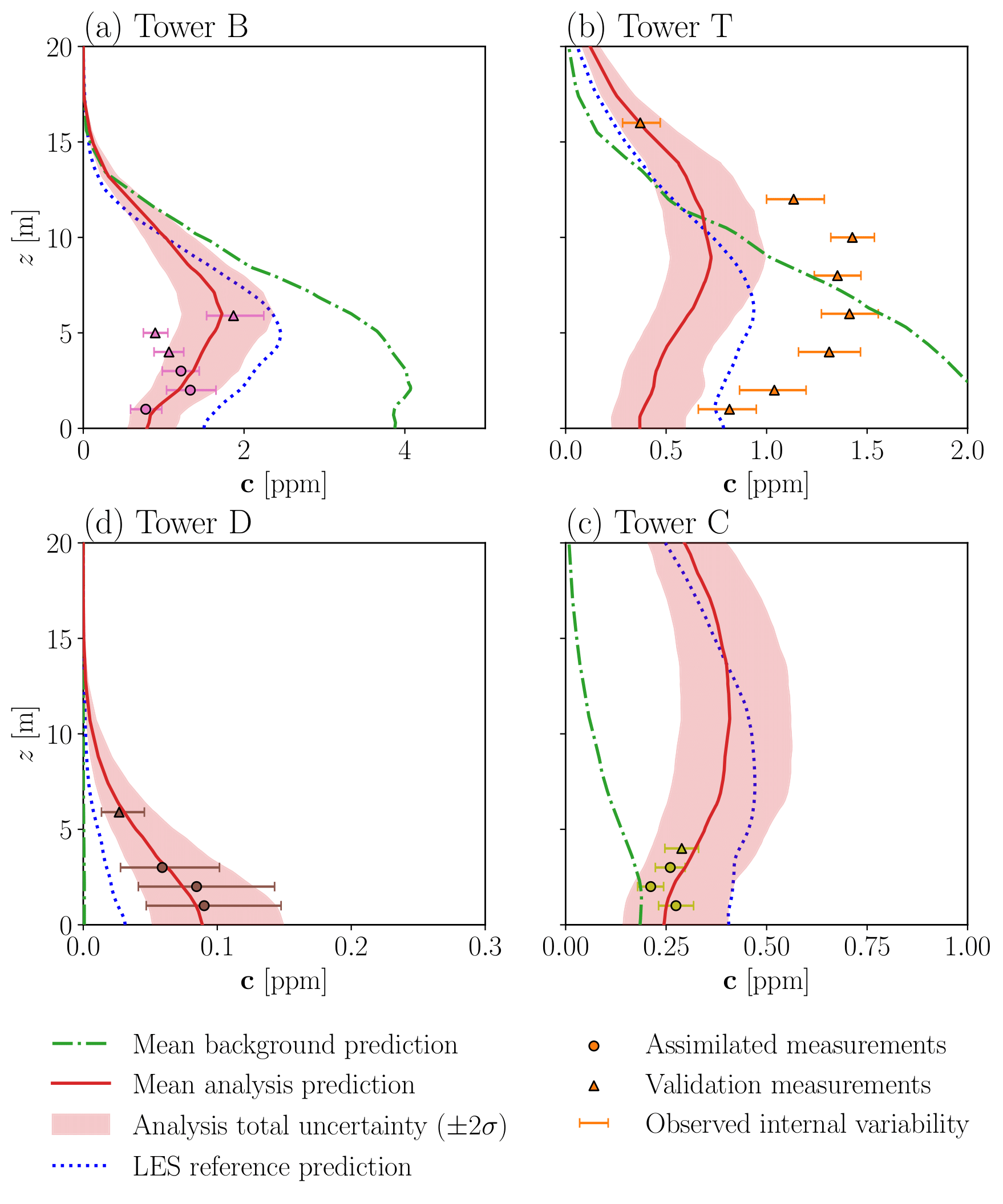 LES plume predictions are improved by the DA system near the source and in the vertical, but persistent underestimation near the ground and downstream remains. These errors cannot be explained solely by meteorological forcing biases or internal variability. This indicates significant structural uncertainties in LES that should be investigated and accounted for in future developments.